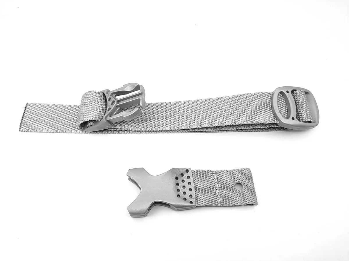 Attache de sécurité équipée d’un clip rapide mâle et femelle, livrée avec son kit de fixation complet.