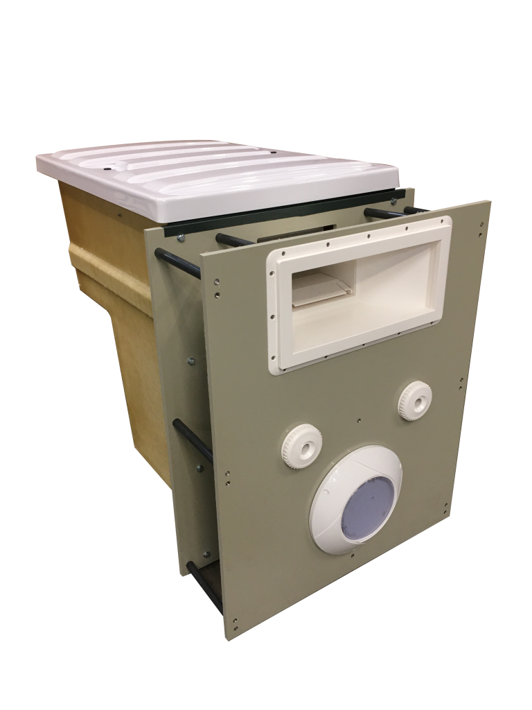 L’unité intégrée disparait dans la structure. À l’œil, seule la façade apparait : skimmer, buses et éclairage. Ainsi, votre piscine garde un aspect épuré, sans combiner filtres, pompes et tuyauterie visible — un vrai plus pour l’esthétique, que ce soit en jardin, chez un particulier ou pour un projet haut de gamme.
